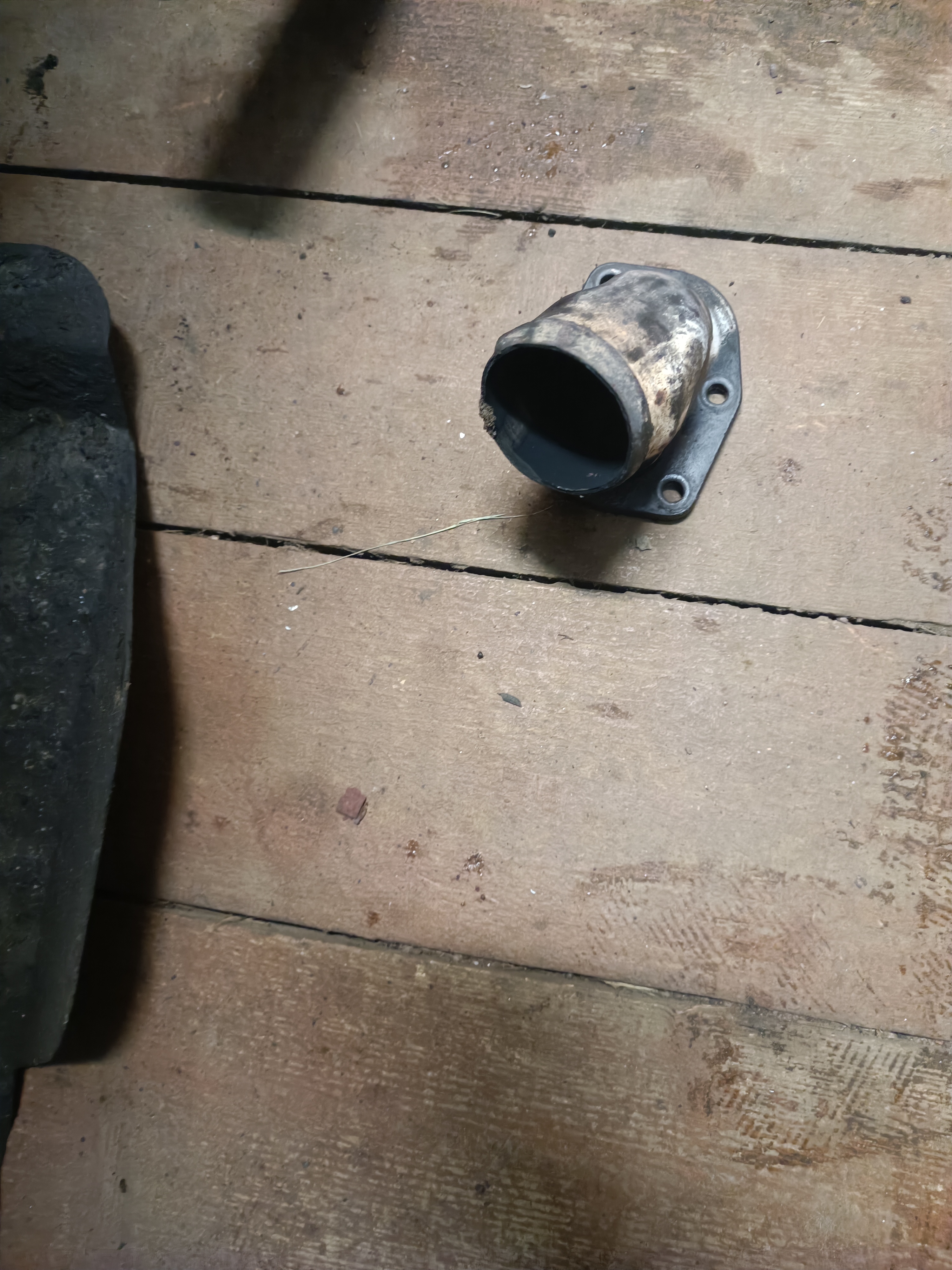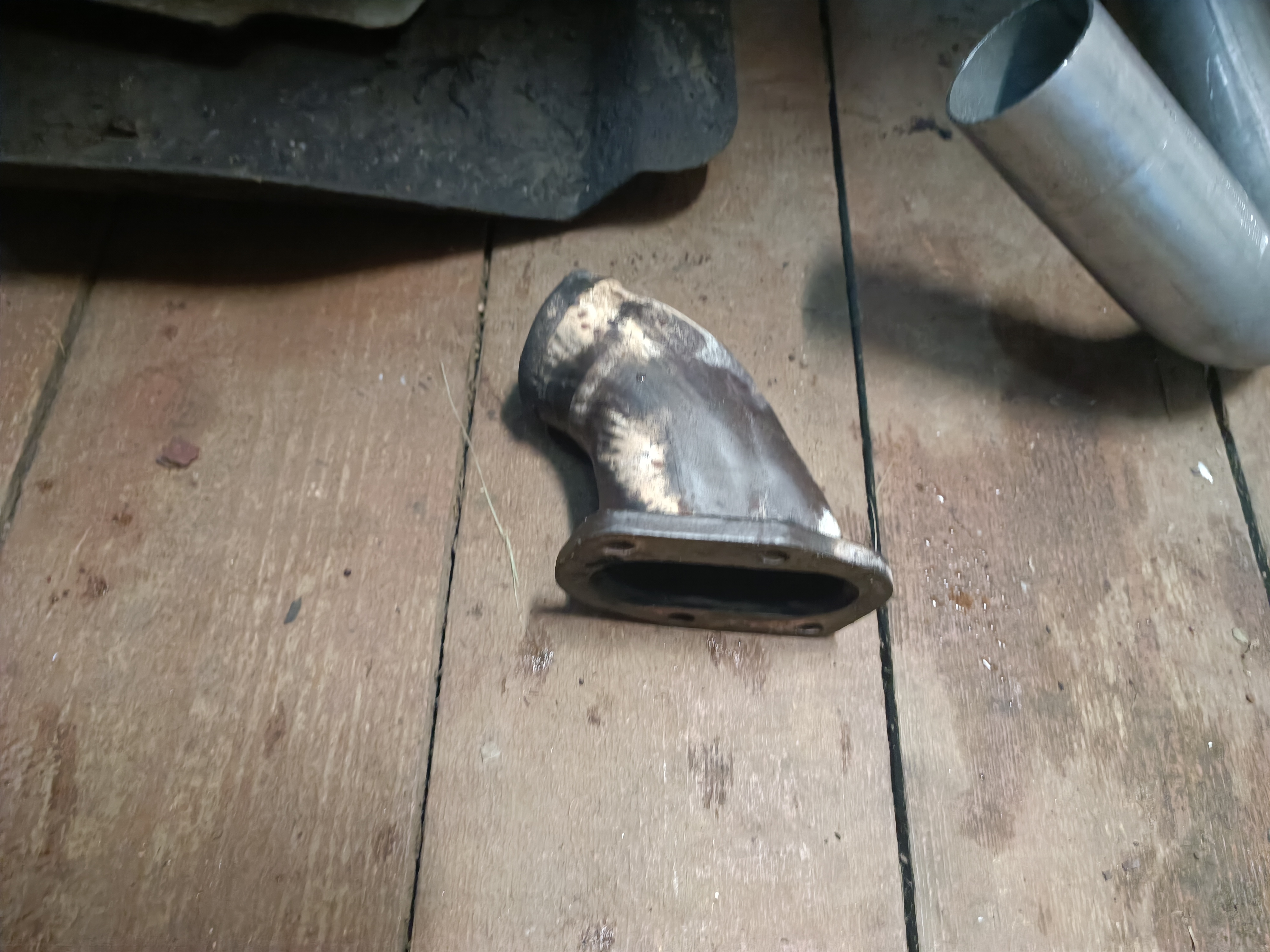 Как-то недели три назад, возвращаясь с огорода, в одном замечательном ГПТ на последнем, третьем, лежачем милиционере раздался аццкий рык табуна в 80 пони... Подумал я опять графитовое кольцо сказало "всё". Ведь банку я менял и трубы шевелил. Но быстрый осмотр показал что там все нормально и замечаний нет, а весь этот звук вырывается откуда-то из моторного отсека. Быстрый осмотр коллектора и приемной трубы ничего не показал, но вот запуск мотора сразу показал - приемная труба отделилась от "штанов" ровно по сварному шву: