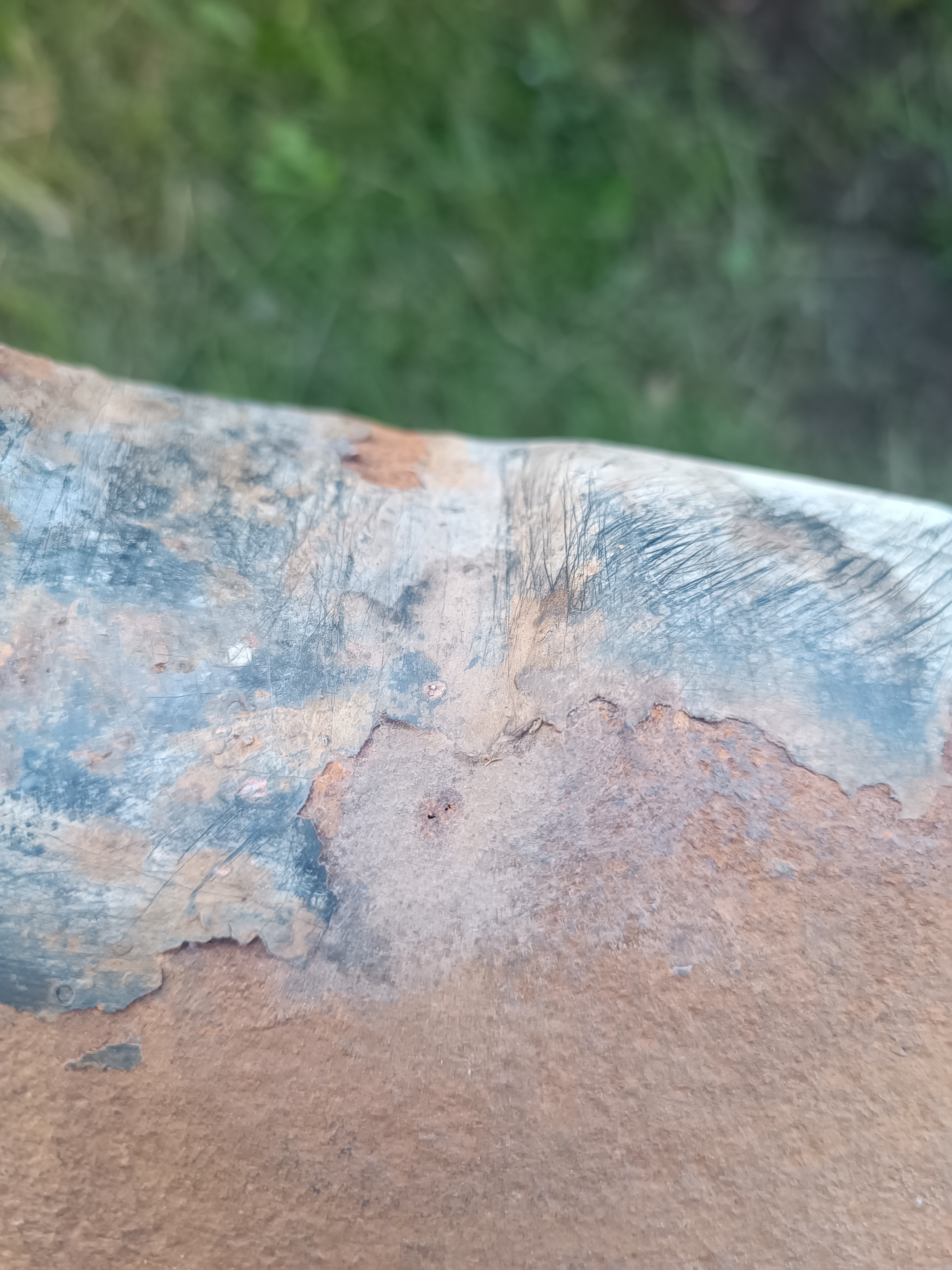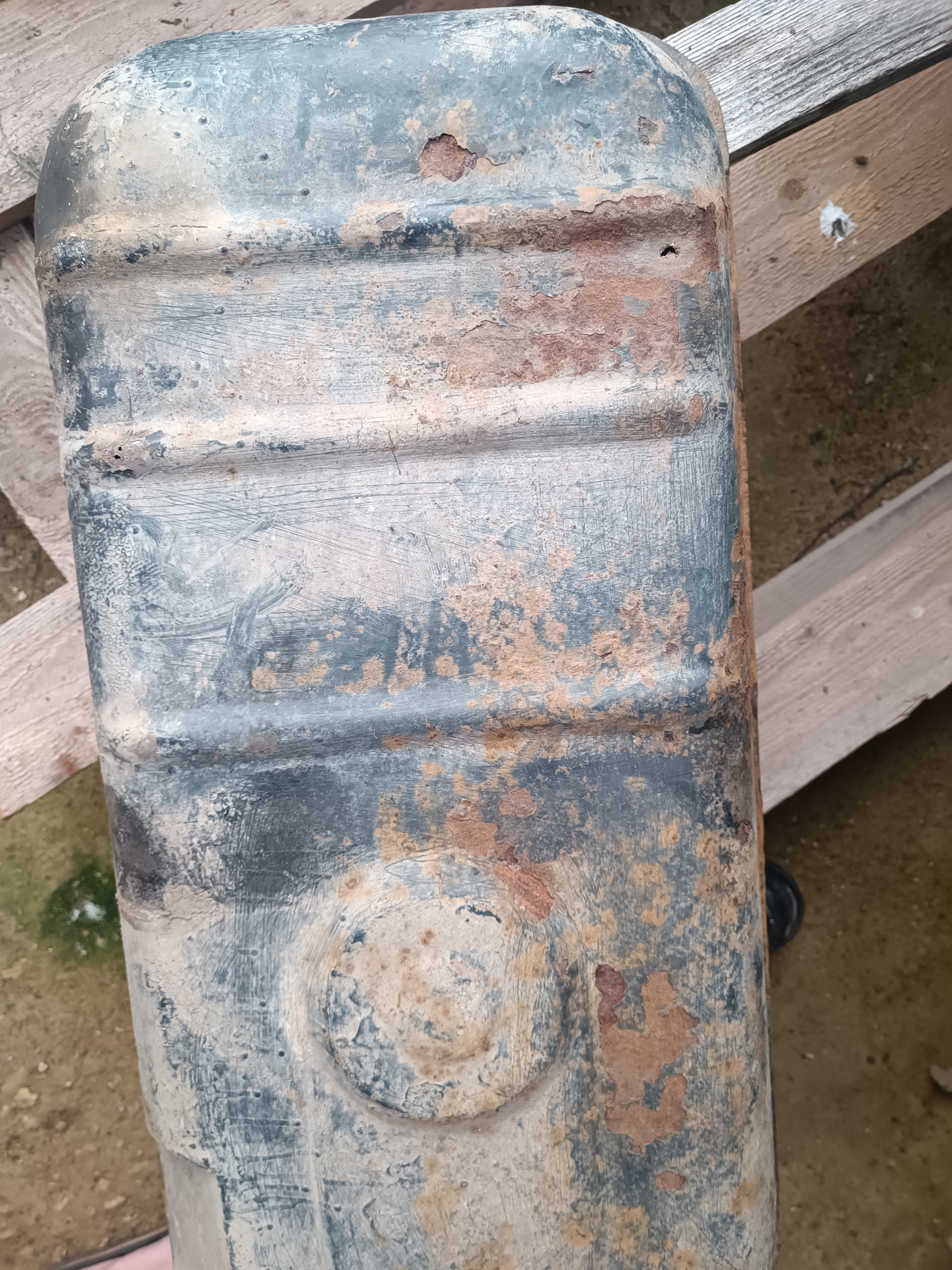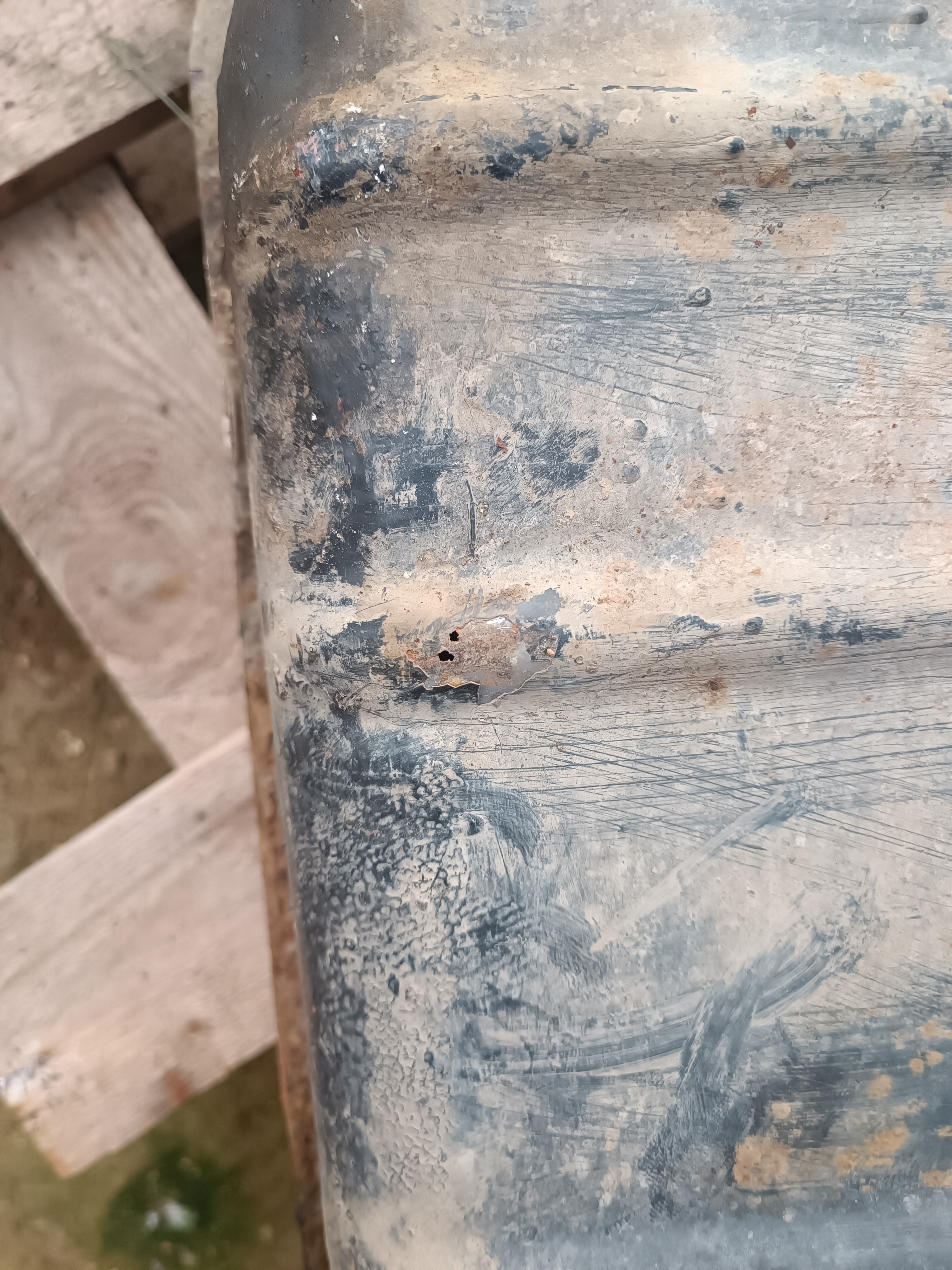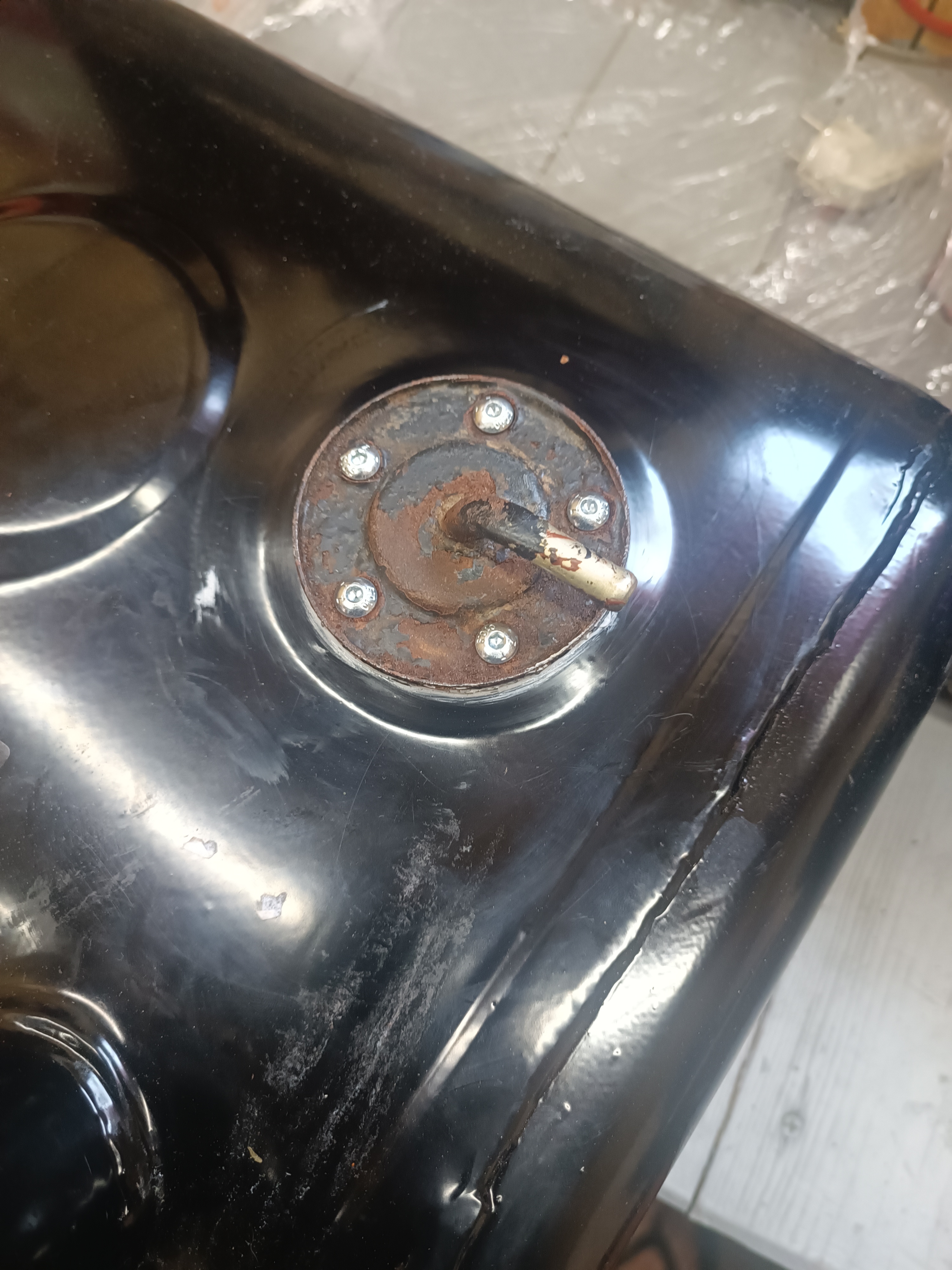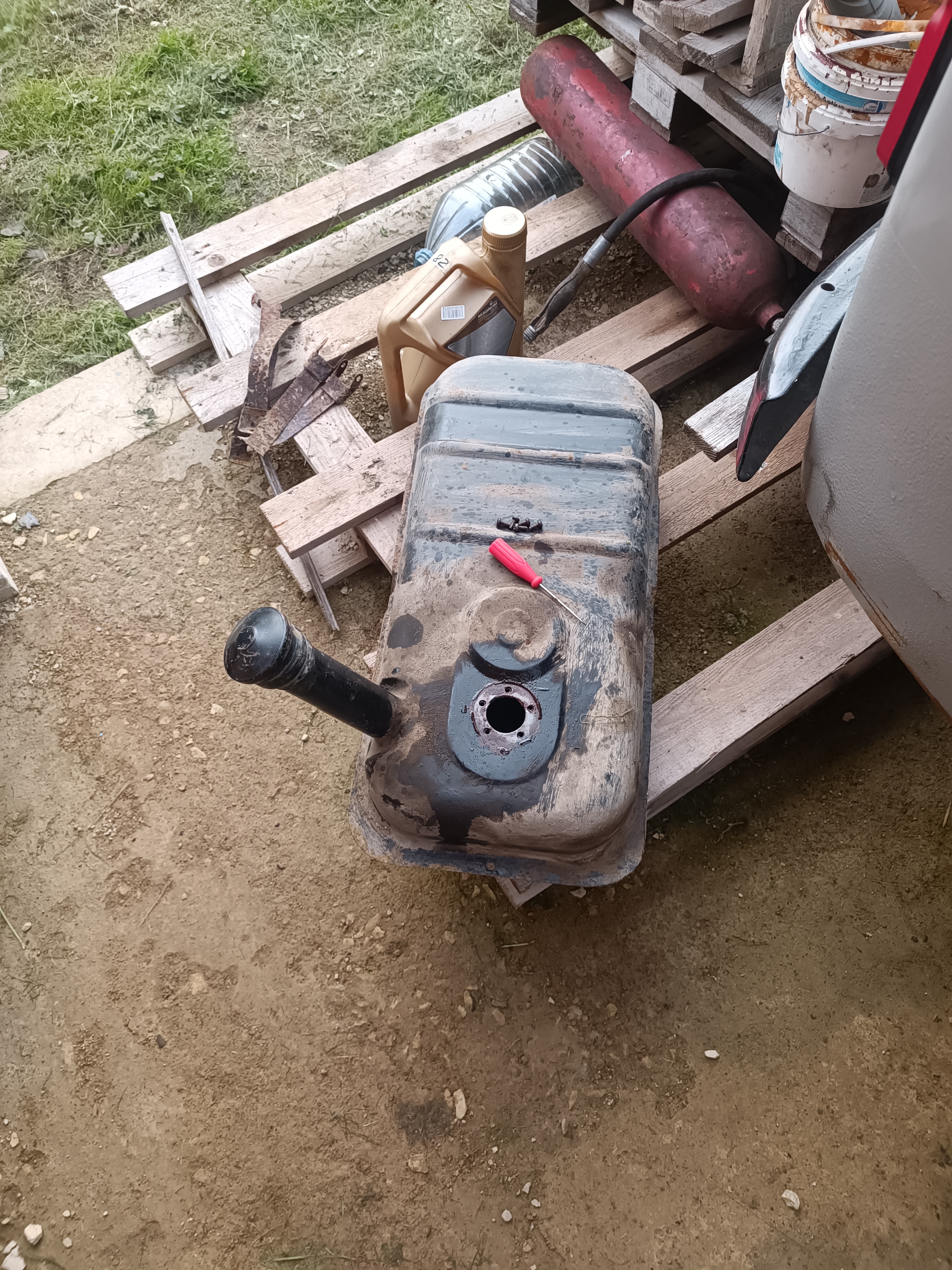 Ну а дальше закрываю надежно пробку на баке, одеваю кусок шланга на топливозаборник и продувочным пистолетом надуваю бак. Ну и он выпрямился в естественное положение. Ну и застремала меня ржавчина под краской - почистил щеткой и пошел окунуть бак подозрительной стороной в бочку, ну и воздуха туда качнул. И увидел два мелких свища. Ну думал, запаяю или заварю - не страшно. Ну и решил нацарапать камушком места свищей. Ну и...