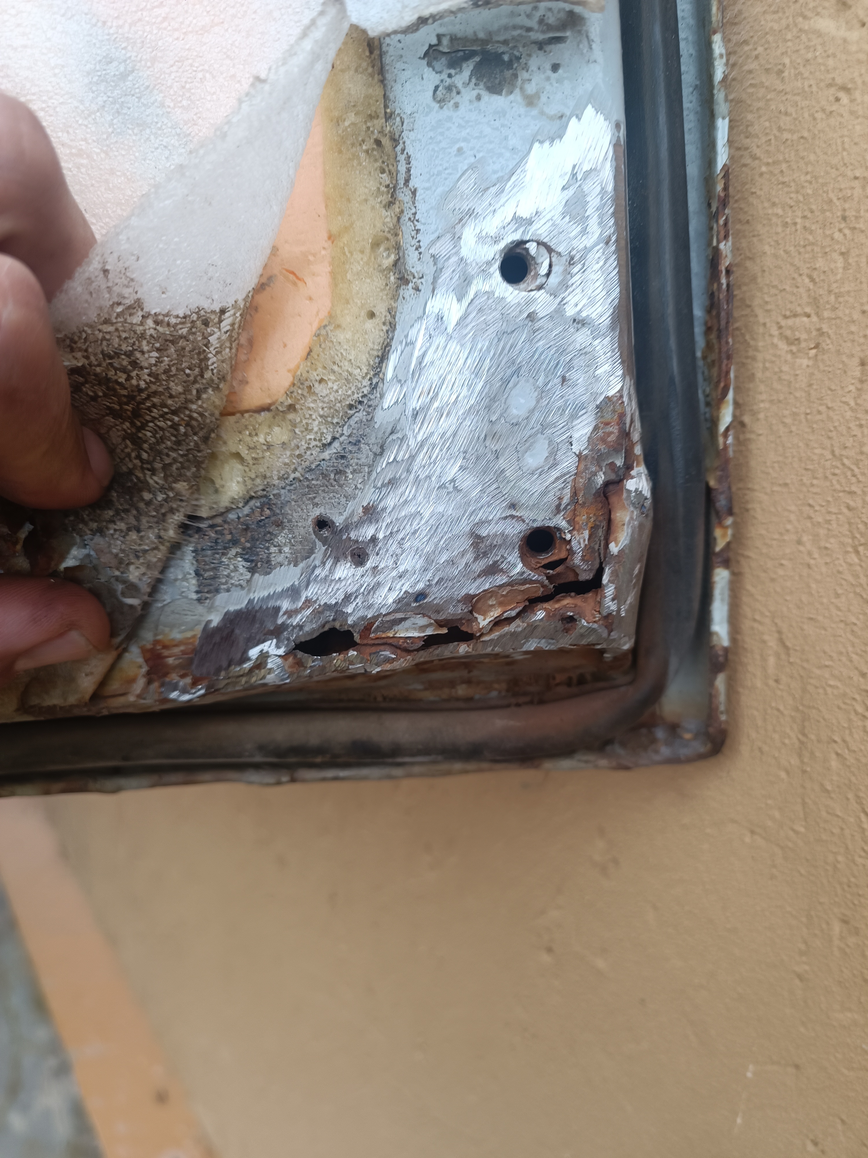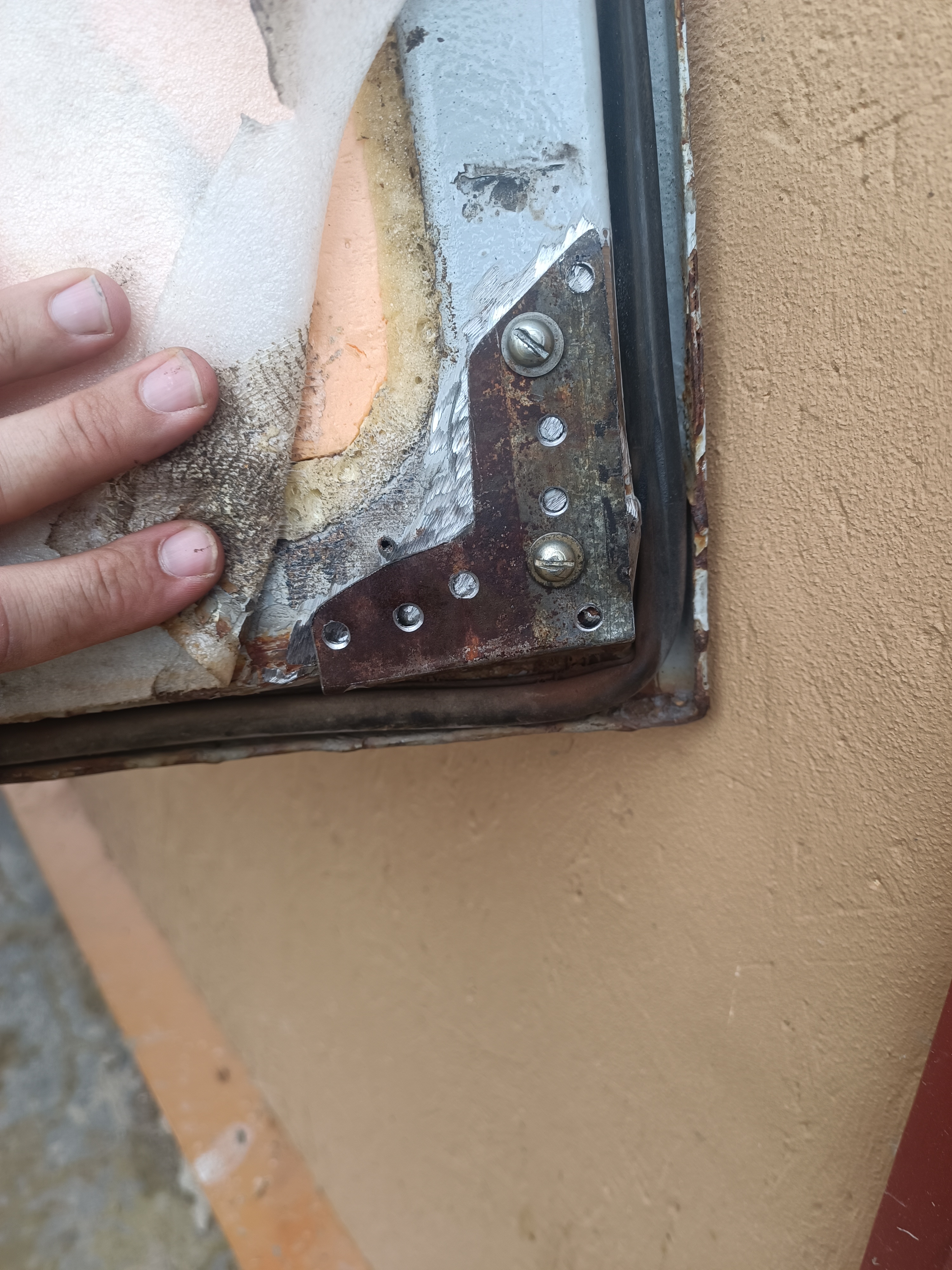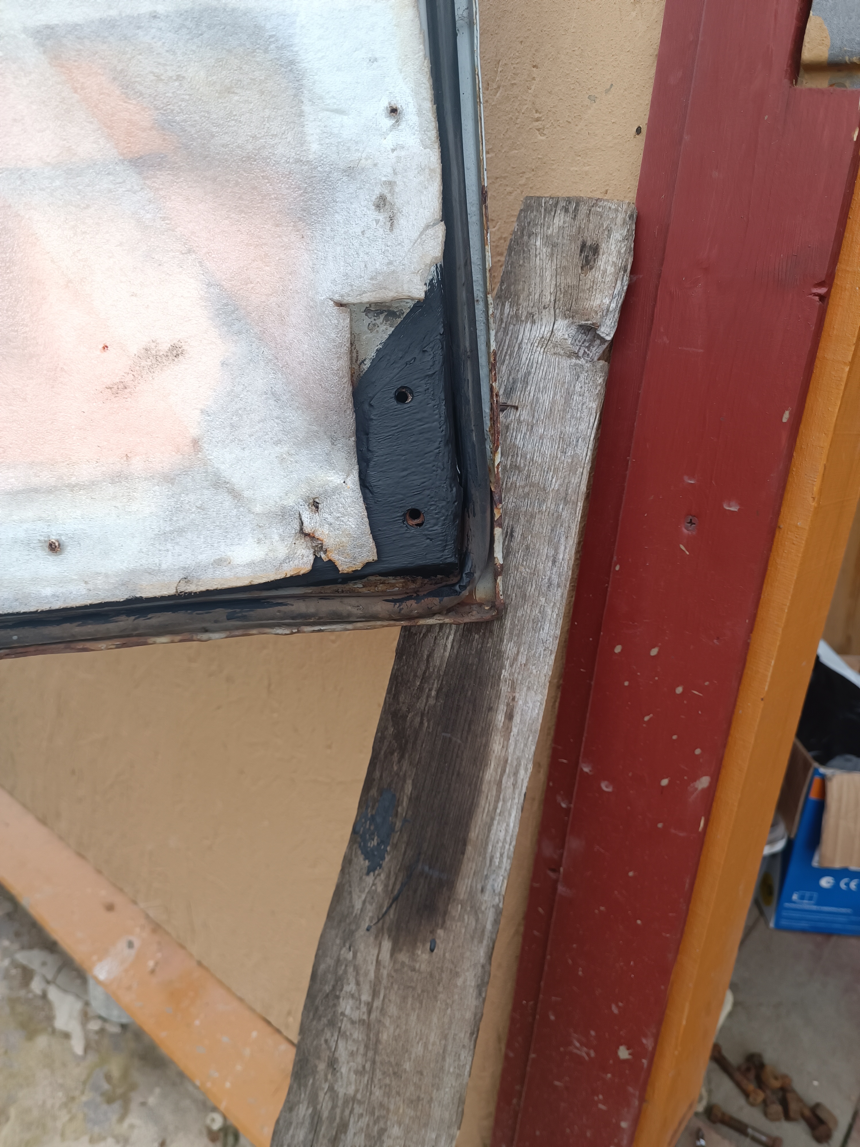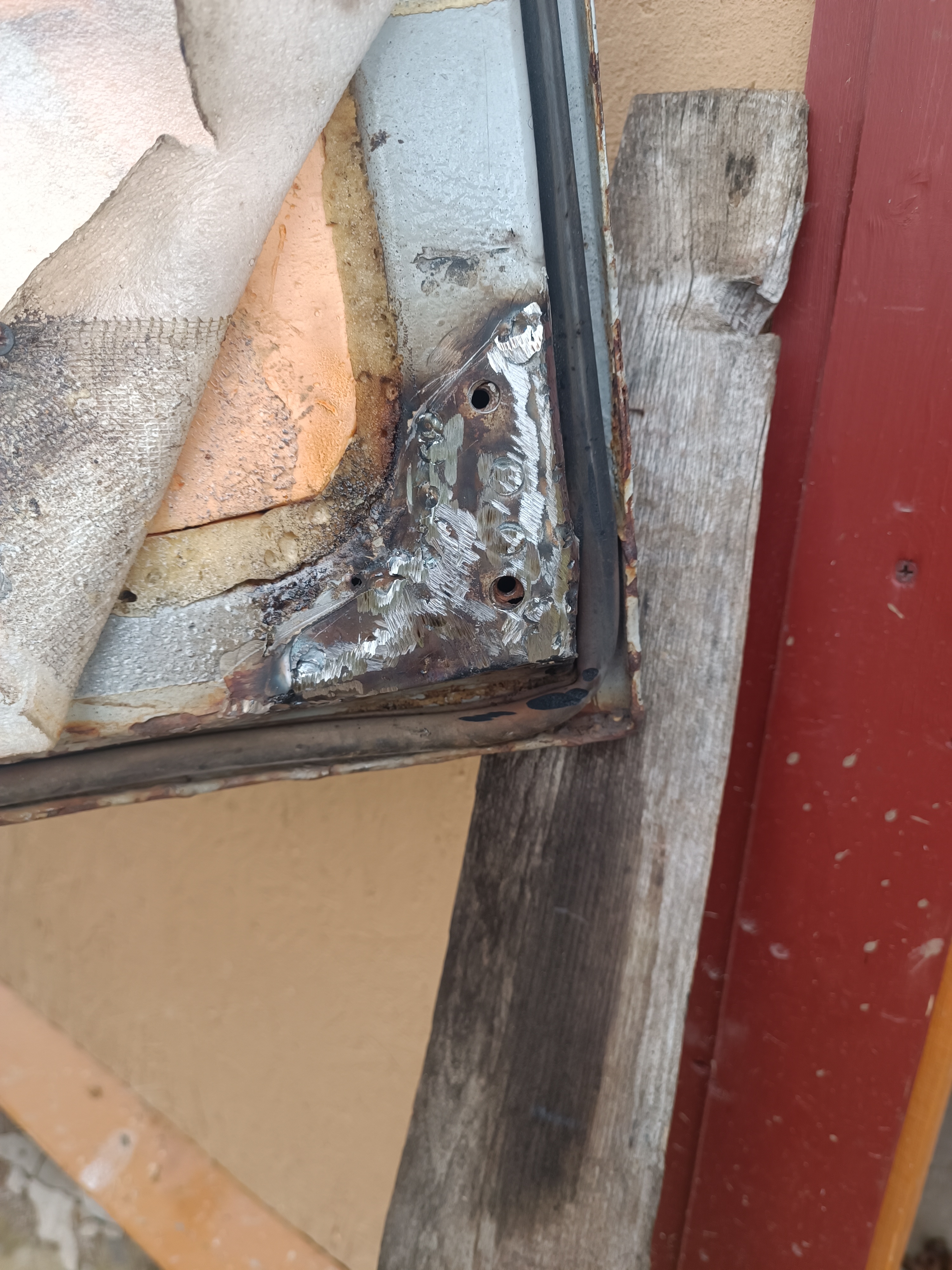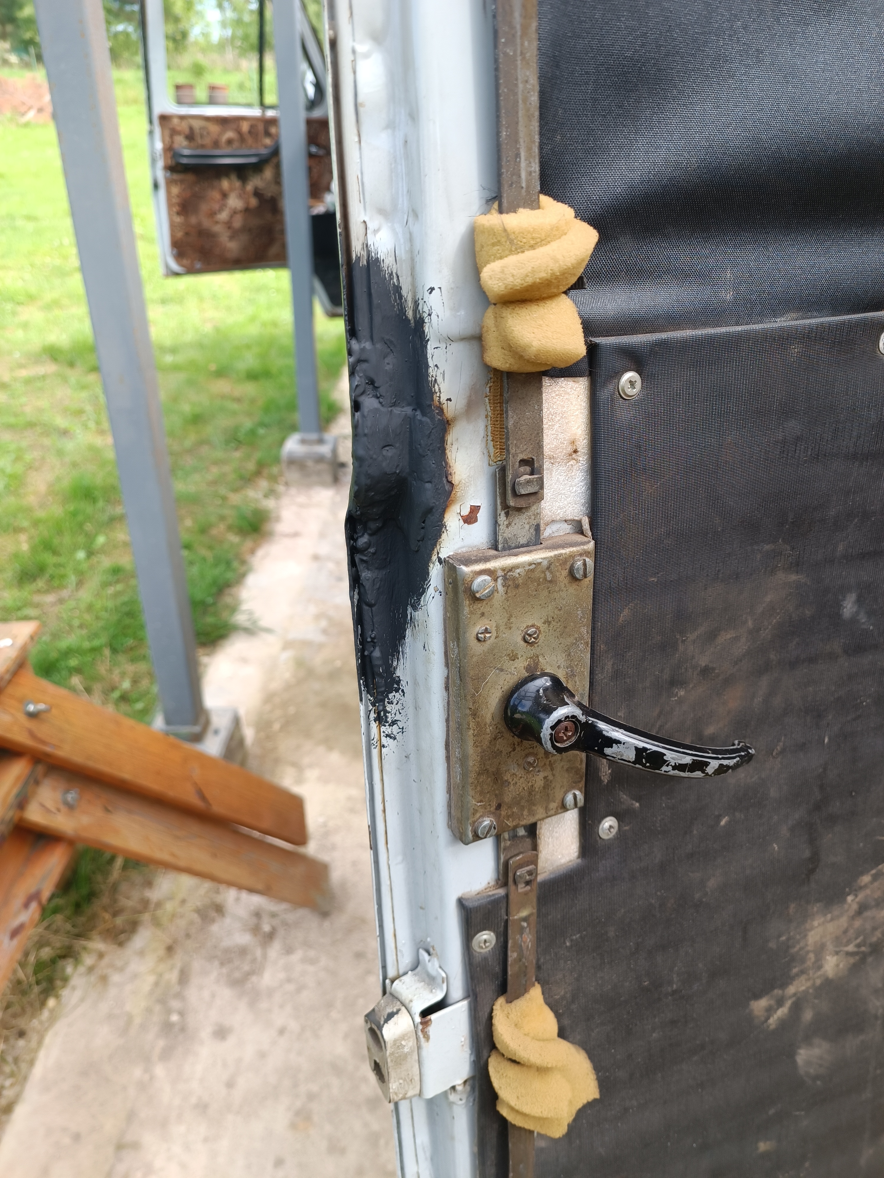 Наружная часть тоже требует сварки. Но там придется шпатлевать и красить. Поэтому я это оставил на потом. Главное дверь дальше уже трещать не будет. И замазал краской ржавую железяку. Так лучше: