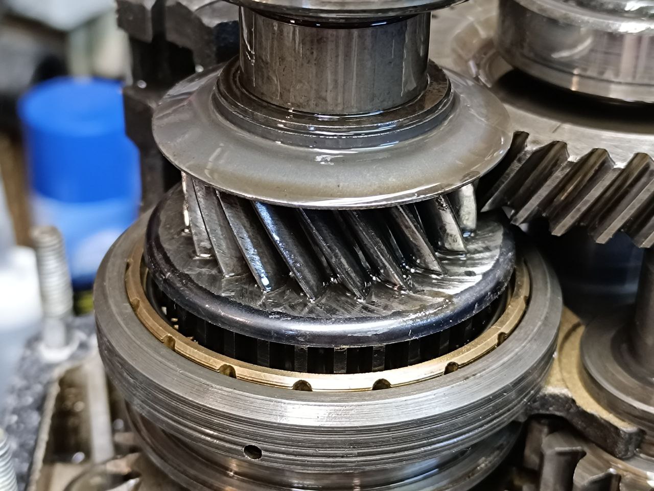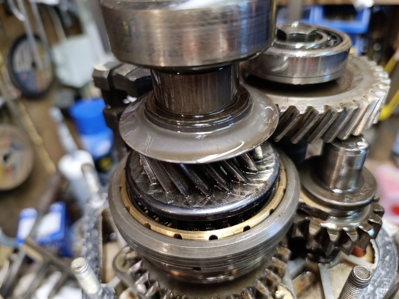 Сразу стало понятно, что проблема где-то в задней части кпп. Можно было снять заднюю часть не снимая кпп с машины, но это не очень комфортно. К тому же снять КПП не так и сложно, а работать на столе легче. Собственно, на следующий вечер кпп была снята и вскрыта. Беглый осмотр ничего криминально не показал. Механизмы живы. Но: