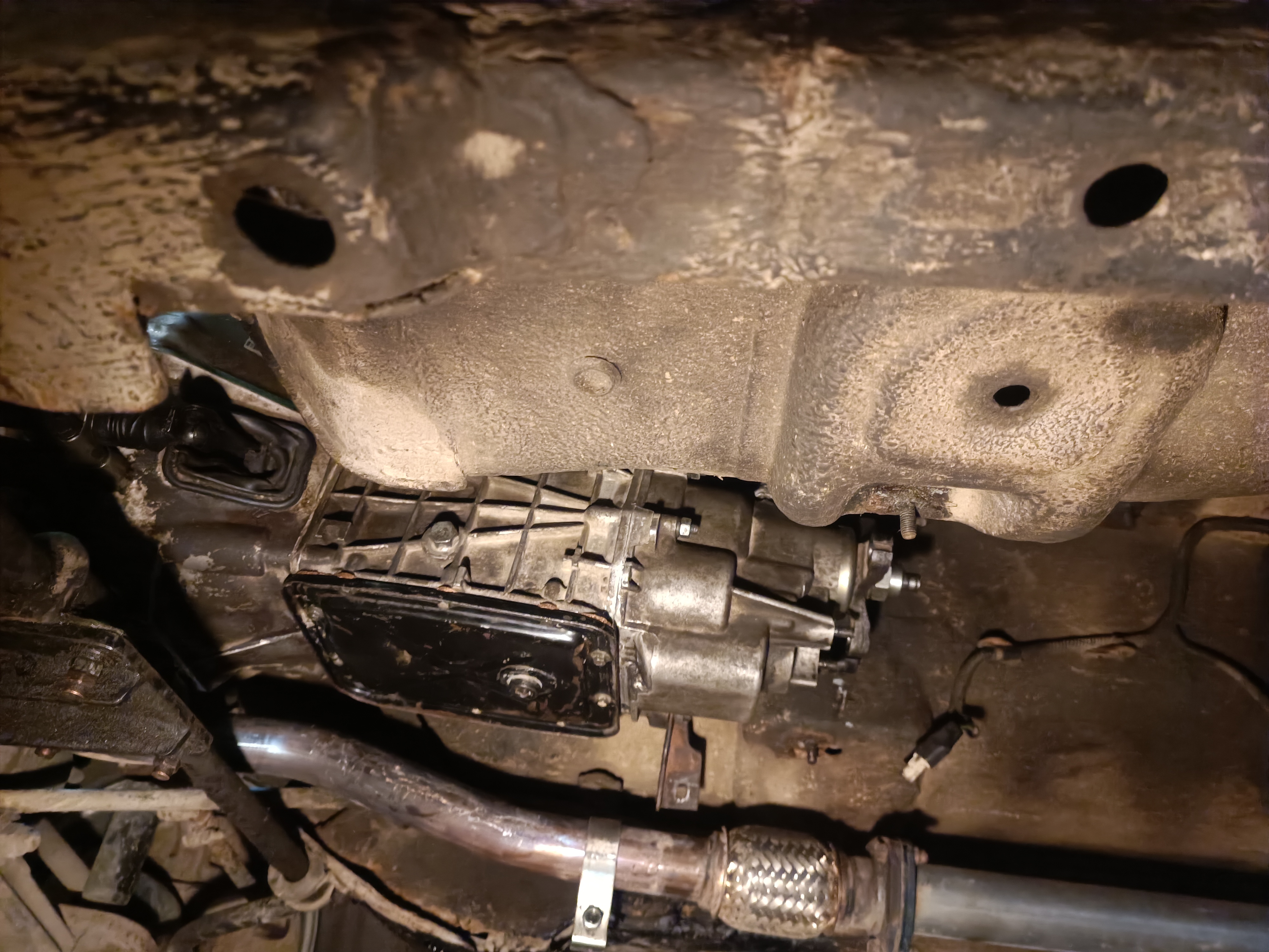 С новой приемной трубой коробку запихивать чуть сложнее. Пришлось ее полностью на место в таком положении на домкрате поднимать.