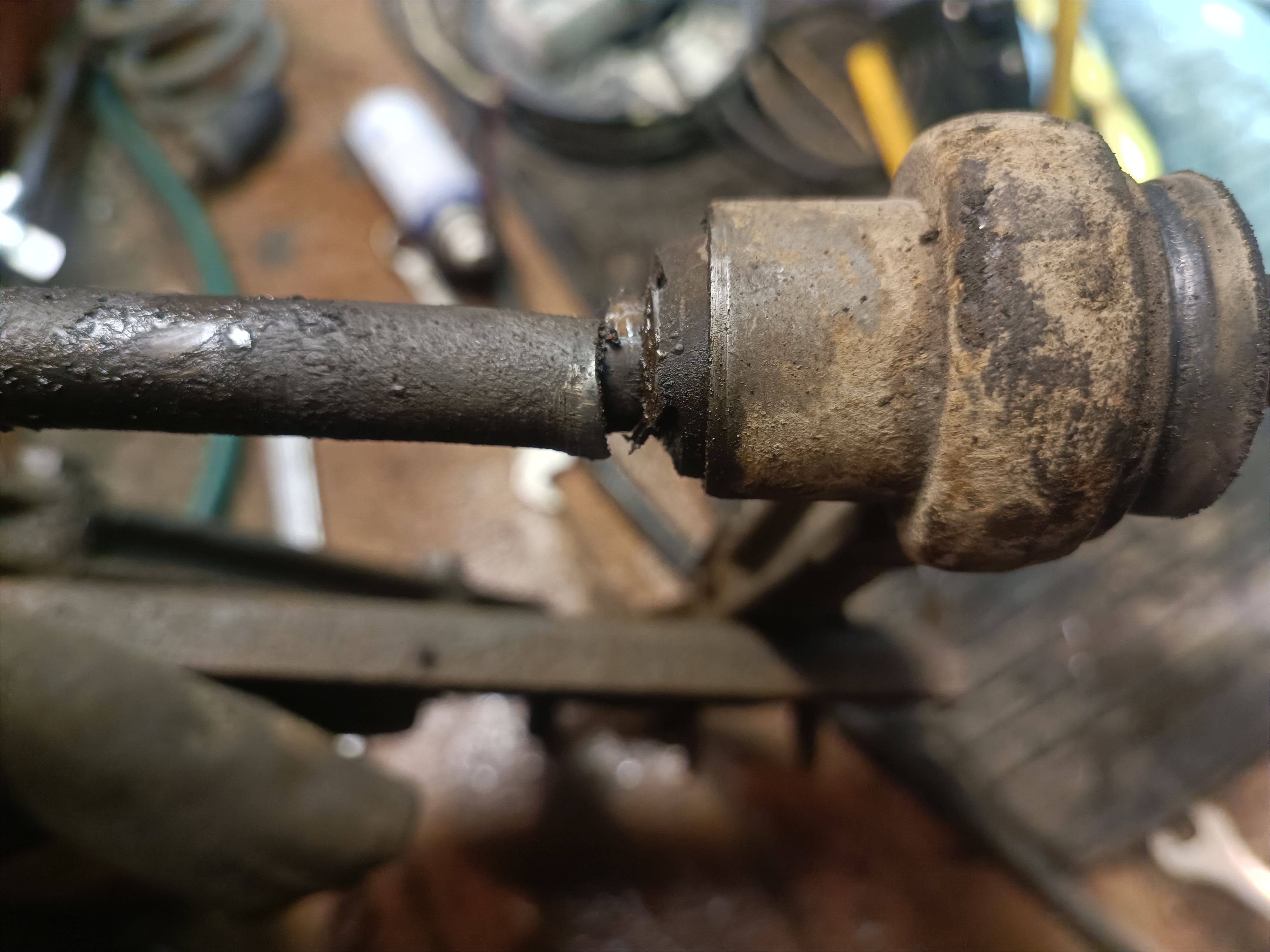 Короче менее чем через час слева рычаг был добыт. Да, болт был согнут и нормально так. Демонтировать пришлось с помощью ключа на 125. Ось из балки выстучал пневатикой достаточно быстро. Делал паузы только чтоб компрессор накачал воздуха побольше. Удобнее чем молотком и совсем не устал.