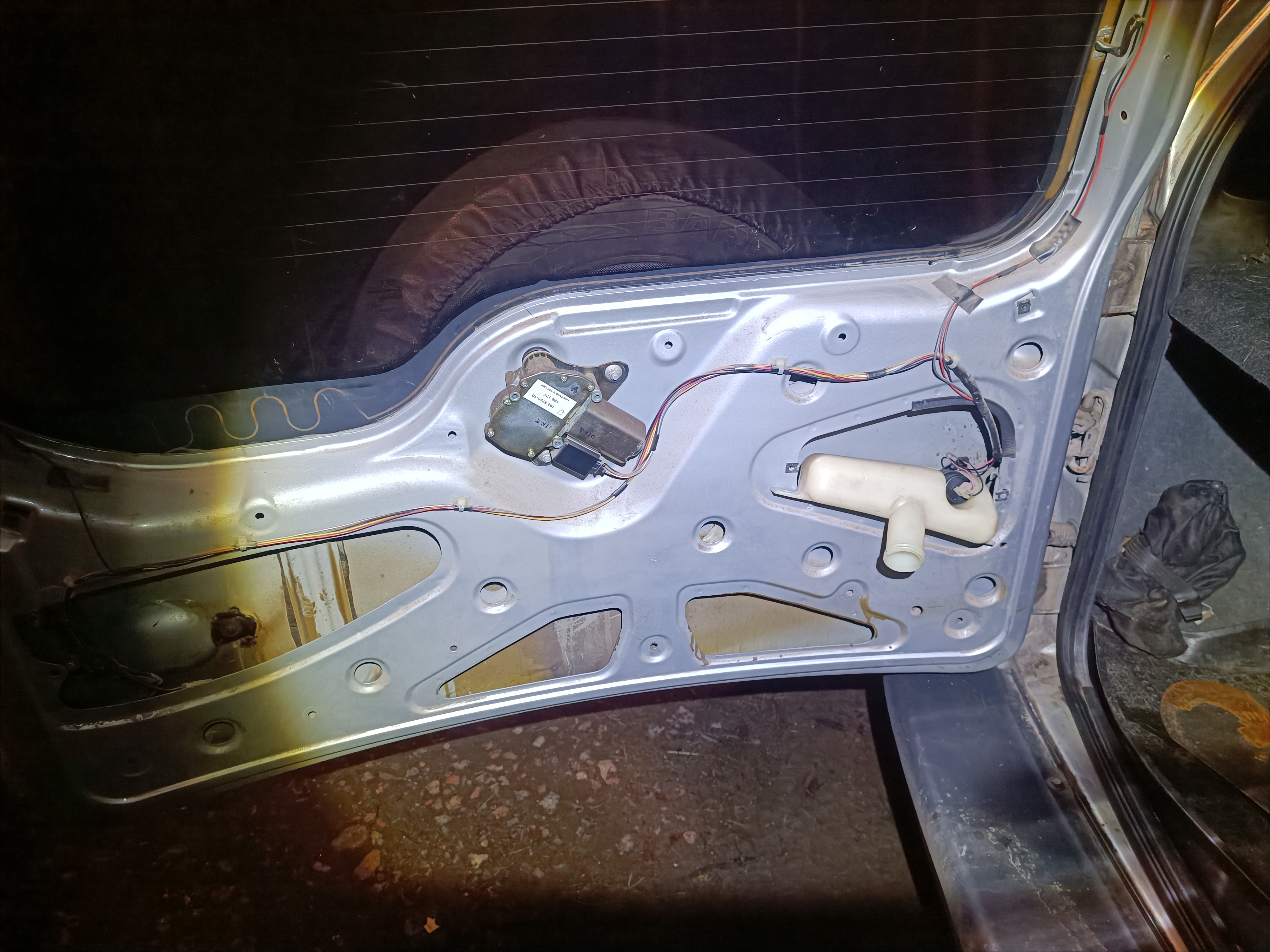 Уже в декабре, как-то заметил что в салоне запахло омывайкой... ну собственно где-то в калитке течь. Опять поехал в гараж разобрал дверь:Думал потек бачок или лопнул шланг, но нет - жижа убегала через электрические клеммы насоса. Такую херню я вижу впервые