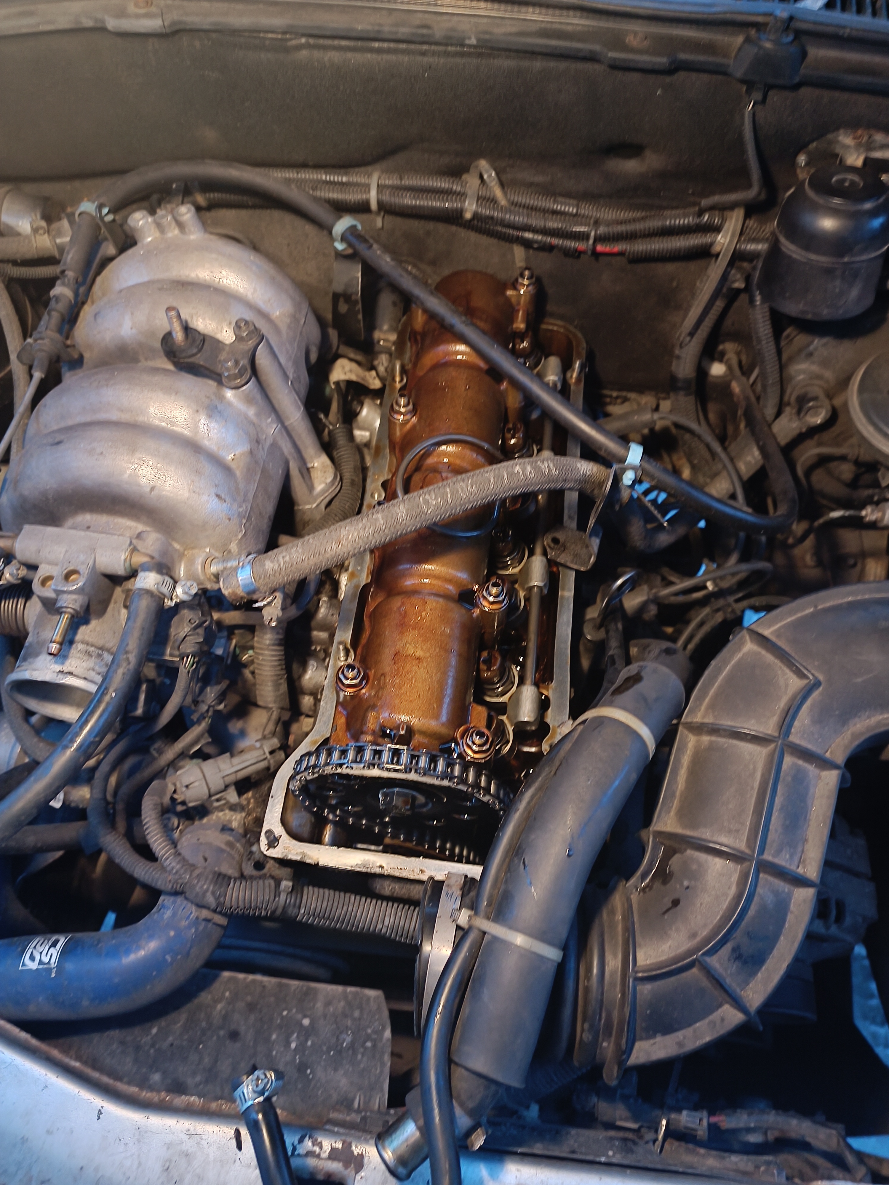 Собственно на каникулах я занимался предпродажной подготовкой - упаковывал всякий зип из гаража, убирал лишнее с машины. И буквально в пятницу надо было поменять прокладку клапанной крышки - она задубела, отверстия под шпильки стали овальные и масло из под клапанки сочилось по шпилькам на гбц. Медленно очень, но вонюче