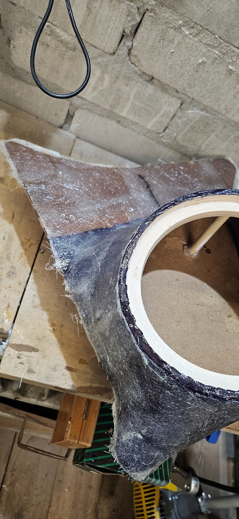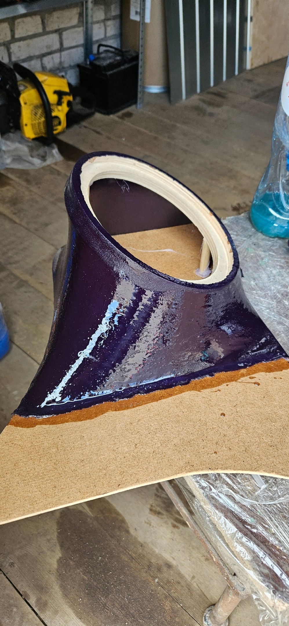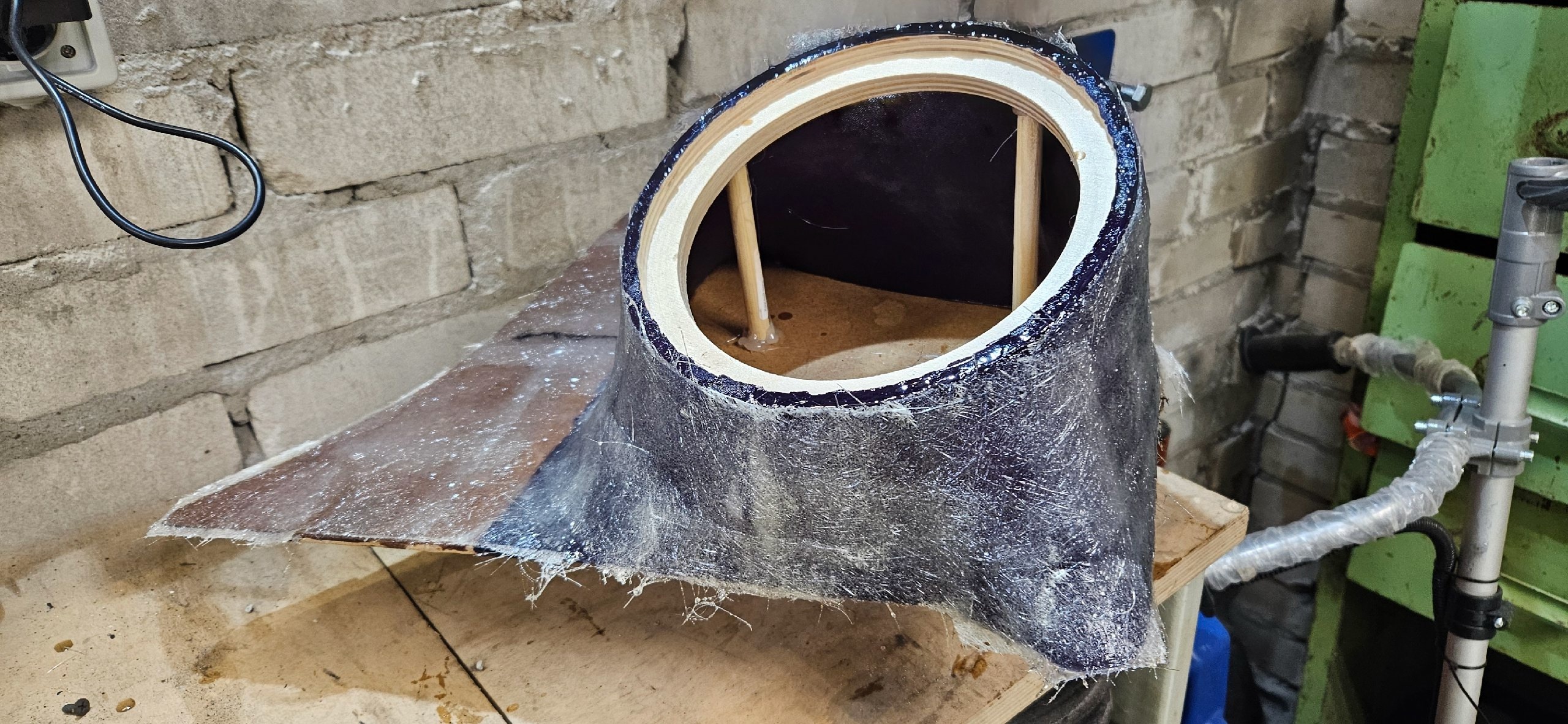 После того как лайкра высохла, она становиться твердой, но ХРУПКОЙ, сольно на нее не давим. Далее я нарезаю стекломат на небольшие кусочки (так удобнее мне клеить) и намазывая на заготовку прикладываю кусочки стекломата. Тут можно допуска небрежность, так как потом это все лего зачистится 40й шкуркой или болгаркой. Я клею кусочки в нахлест. Делаю сразу 2 слоя, после чего даю высохнуть и смотрю где просела смола и нужно добавить, после чего делаю еще 2 слоя. Затем снимаю внутренние распорки и делаю еще 2 слоя внутри. Итог 4 внешних слоя и 2 внутренних, для динамиков вполне хватит и будет несильно громоздко.