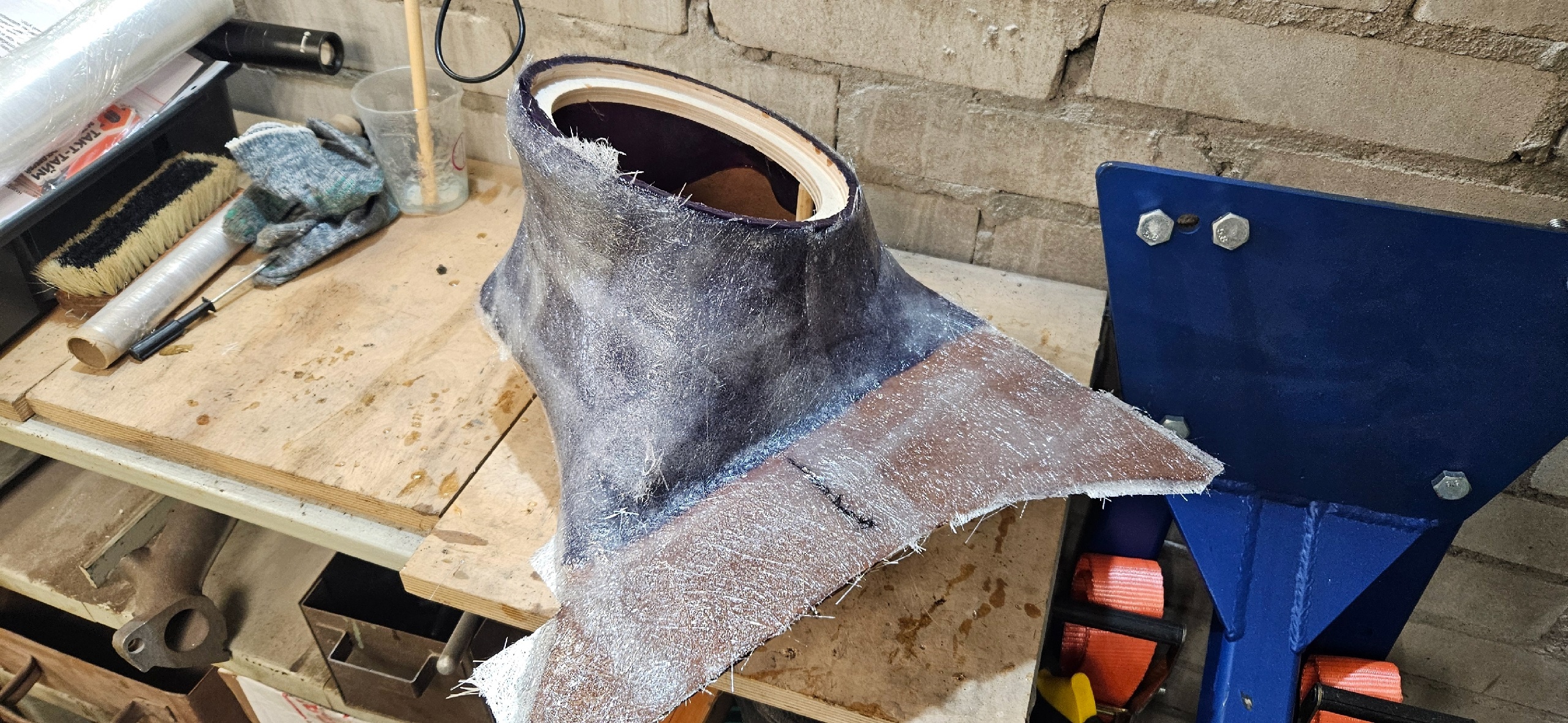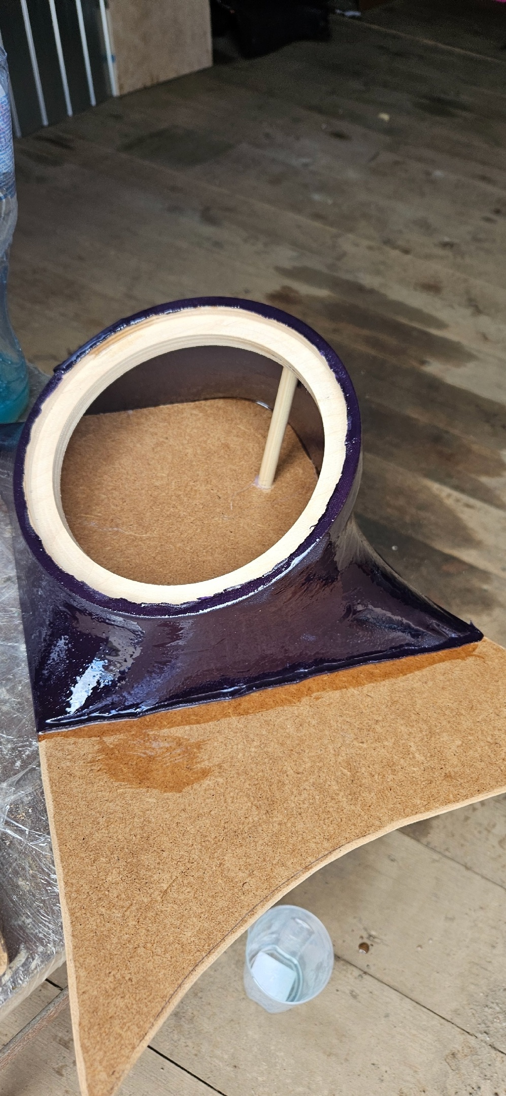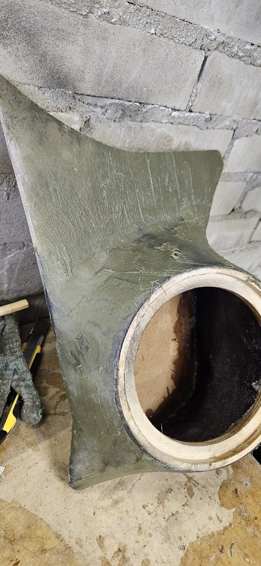 После того как лайкра высохла, она становиться твердой, но ХРУПКОЙ, сольно на нее не давим. Далее я нарезаю стекломат на небольшие кусочки (так удобнее мне клеить) и намазывая на заготовку прикладываю кусочки стекломата. Тут можно допуска небрежность, так как потом это все лего зачистится 40й шкуркой или болгаркой. Я клею кусочки в нахлест. Делаю сразу 2 слоя, после чего даю высохнуть и смотрю где просела смола и нужно добавить, после чего делаю еще 2 слоя. Затем снимаю внутренние распорки и делаю еще 2 слоя внутри. Итог 4 внешних слоя и 2 внутренних, для динамиков вполне хватит и будет несильно громоздко.