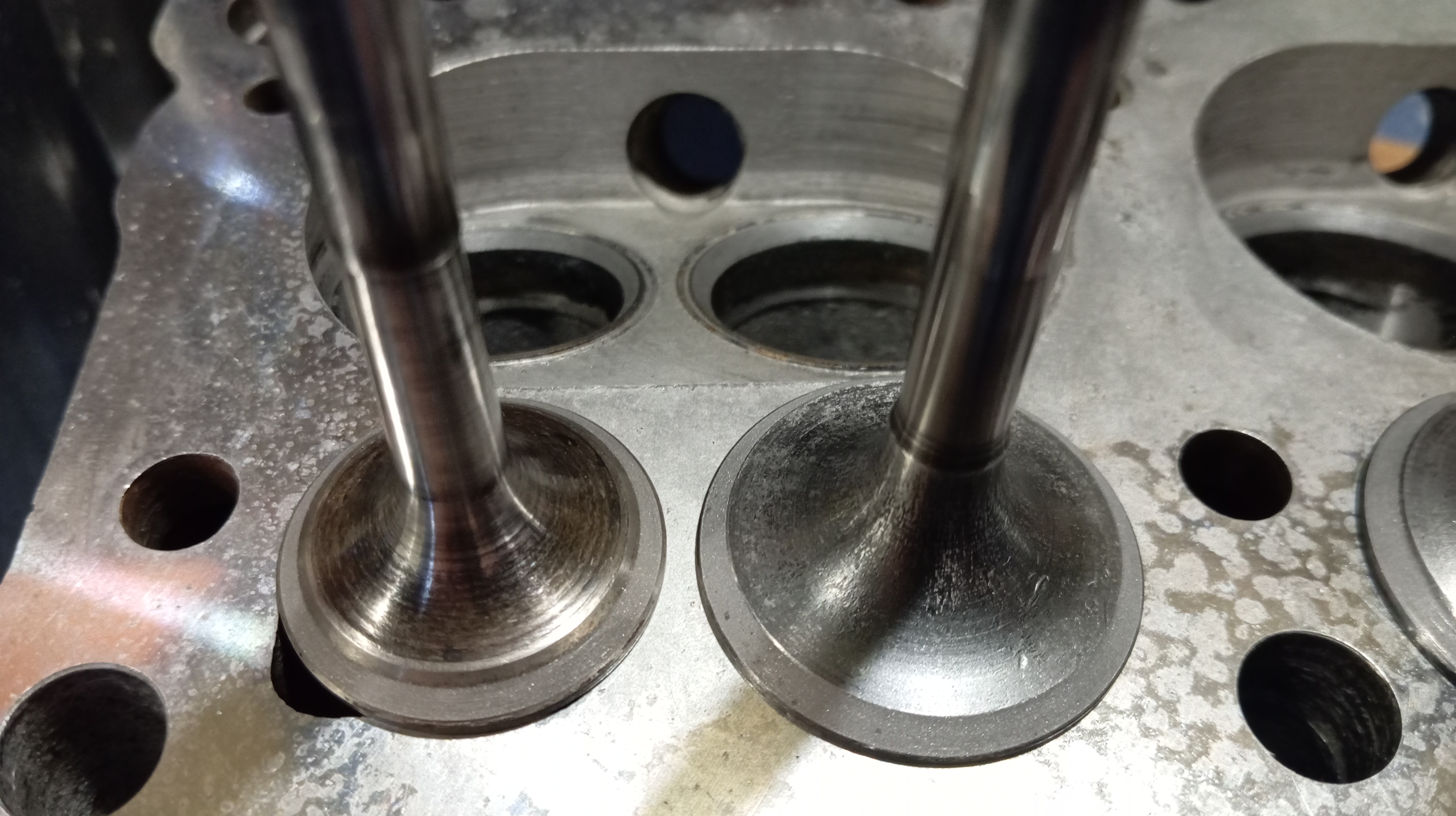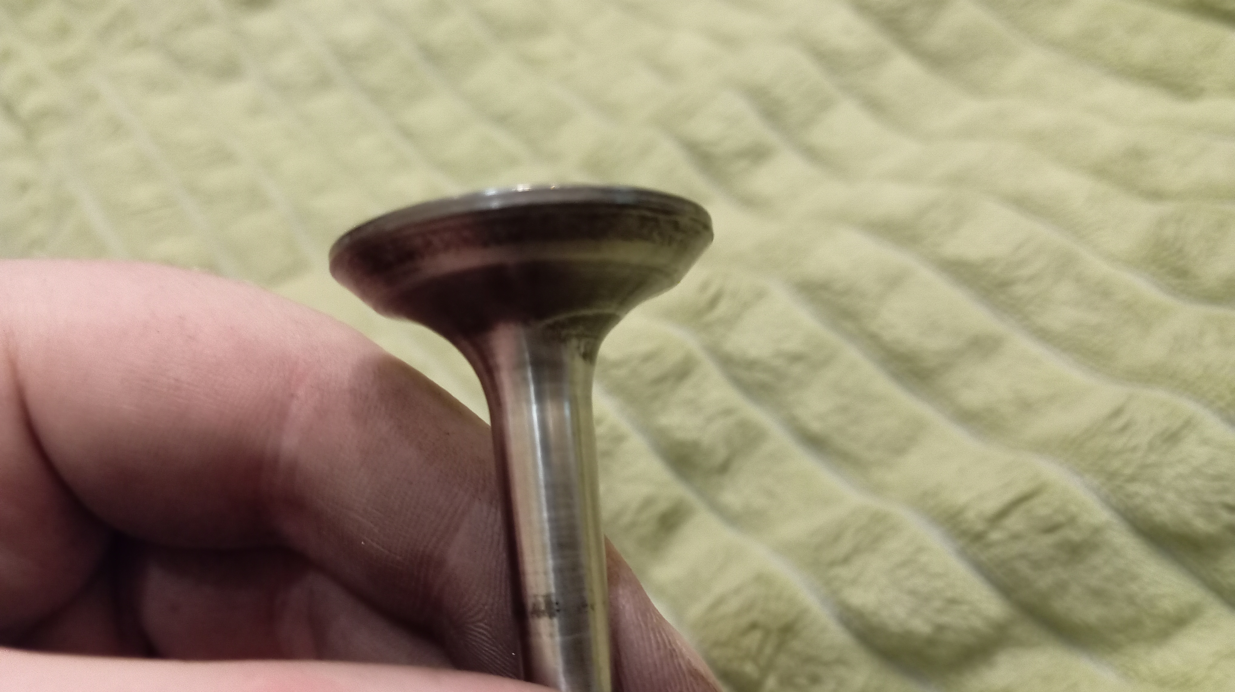 После отмывки на клапанах все равно остался налёт, поэтому дополнительно с помощью дрели и красного скотчбрайта привёл их в порядок. На пятом клапане была непонятная деформация, но на поршне отметин не было. Однако после притирки клапан отлично держит, так что на эту проблему можно не обращать внимание.